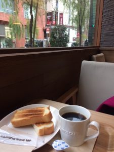 次なる用事は衣裳用パーツのお店だったのですが、開店時間を間違え、開店まで2杯目の☕(お店の方にお得ですよ☆と勧められついついモーニングセット…食べました。もちろん♡)